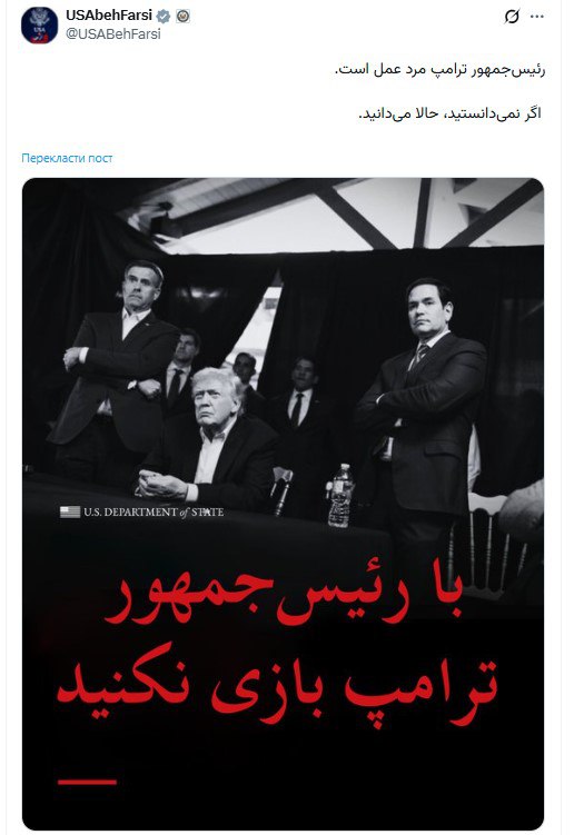 Родзинка в написі, який зроблений на фарсі, мові Ірану. «Президент Трамп – людина справи. Якщо ви не знали, то тепер знаєте», – такий підпис під фото, зробленим у ситуативній кімнаті під час операції з вилучення з Венесуели Ніколаса Мадуро.