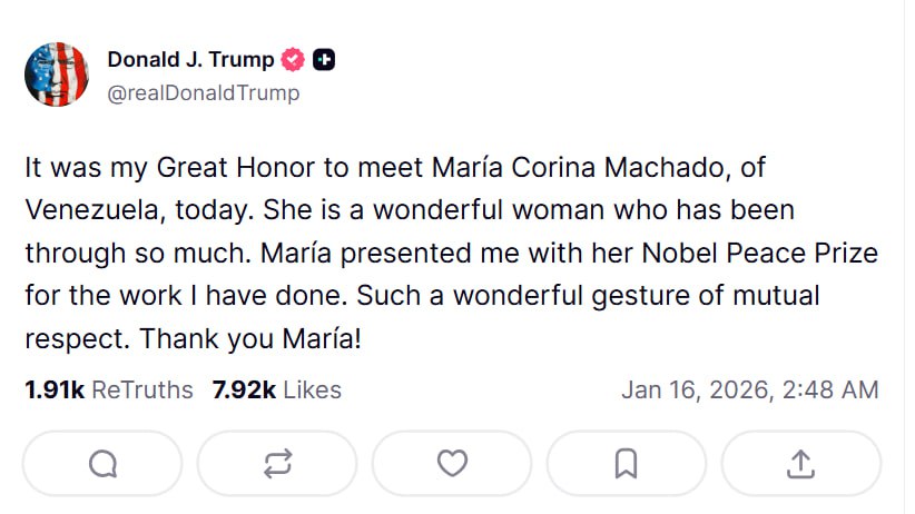 “Марія вручила мені свою Нобелівську премію миру за роботу, яку я зробив. Надзвичайно гарний жест взаємної поваги. Дякую, Маріє!”, — написав президент США Дональд Трамп.