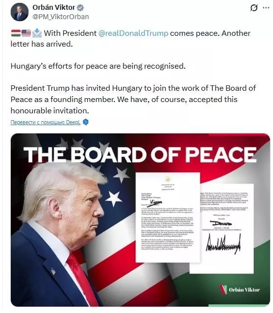 “Президент Трамп запросив Угорщину приєднатися до роботи Ради миру як засновника. Ми, звичайно, прийняли цю почесну пропозицію”, – написав Орбан.