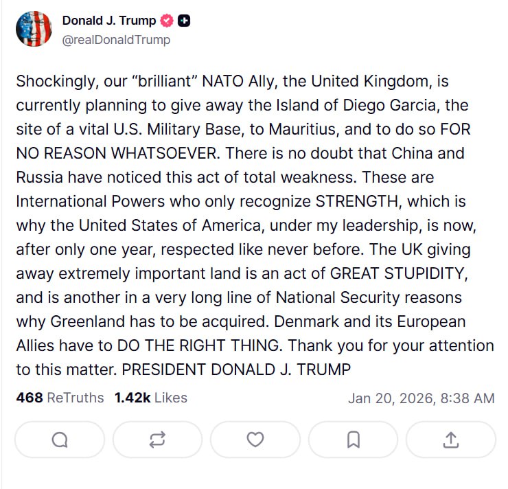“Шокує, але наш «блискучий» союзник по НАТО, Велика Британія, зараз планує віддати острів Дієго-Гарсія, місце розташування життєво важливої військової бази США, Маврикію, і зробити це БЕЗ БУДЬ-ЯКОЇ ПРИЧИНИ. Немає сумнівів, що Китай і Росія помітили цей акт повної слабкості. Це міжнародні держави, які визнають лише СИЛУ, тому Сполучені Штати Америки під моїм керівництвом тепер, лише через рік, поважаються як ніколи раніше. Віддача Великою Британією надзвичайно важливої землі – це акт ВЕЛИКОЇ ГЛУПОСТІ та ще одна з дуже довгого ряду причин національної безпеки, чому Гренландію потрібно придбати. Данія та її європейські союзники повинні РОБИТИ ПРАВИЛЬНО. Дякую за вашу увагу до цього питання. ПРЕЗИДЕНТ ДОНАЛЬД ДЖ. ТРАМП”.