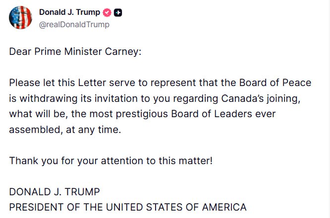 «Шановний пане прем’єр-міністр Карні! Справжнім листом повідомляємо, що Рада світу відкликає направлене вам запрошення щодо вступу Канади до складу того, що стане найпрестижнішою порадою лідерів, яка будь-коли збиралася в історії», — написав Трамп.