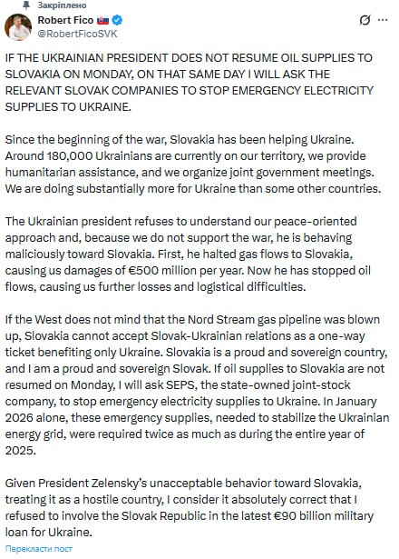 Якщо Захід не переймається тим, що газопровід «Північний потік» був підірваний, Словаччина не може сприймати словацько-українські відносини як односторонній квиток, який приносить користь лише Україні. Словаччина — горда і суверенна країна, а я — гордий і суверенний словак. Якщо постачання нафти до Словаччини не буде відновлено в понеділок, я попрошу державну акціонерну компанію SEPS припинити аварійне постачання електроенергії до України. Тільки в січні 2026 року ці аварійні поставки, необхідні для стабілізації української енергосистеми, були потрібні в два рази більше, ніж протягом усього 2025 року.