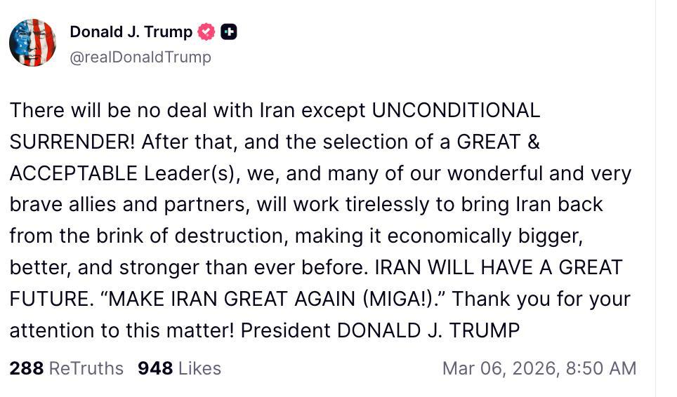 “З Іраном не буде жодної угоди, окрім БЕЗУМОВНОЇ КАПІТУЛЯЦІЇ! Після цього, та обрання ВЕЛИКОГО ТА ПРИЙНЯТНОГО Лідера(ів), ми, і багато наших чудових і дуже сміливих союзників і партнерів, будемо невпинно працювати, щоб повернути Іран з межі знищення, зробивши його економічно більшим, кращим і сильнішим, ніж будь-коли раніше. ІРАН МАТИМЕ ВЕЛИКЕ МАЙБУТНЄ. «ЗРОБІТЬ ІРАН ЗНОВУ ВЕЛИКИМ (MIGA!)». Дякую за вашу увагу до цього питання! Президент ДОНАЛЬД ДЖ. ТРАМП”.