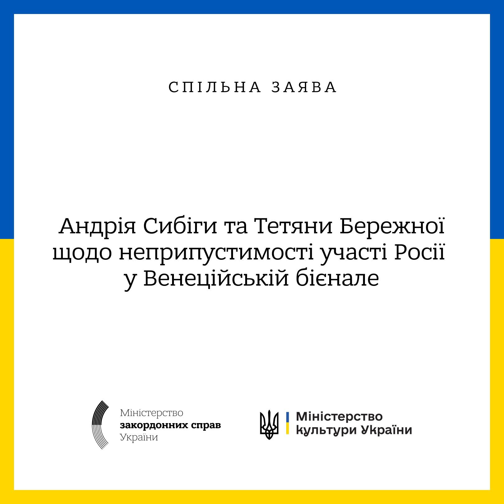Очільники МЗС та Міністерства культури України Андрій Сибіга та Тетяна Бережна зробили спільну заяву щодо неприпустимості участі росії у Венеційській бієнале.
