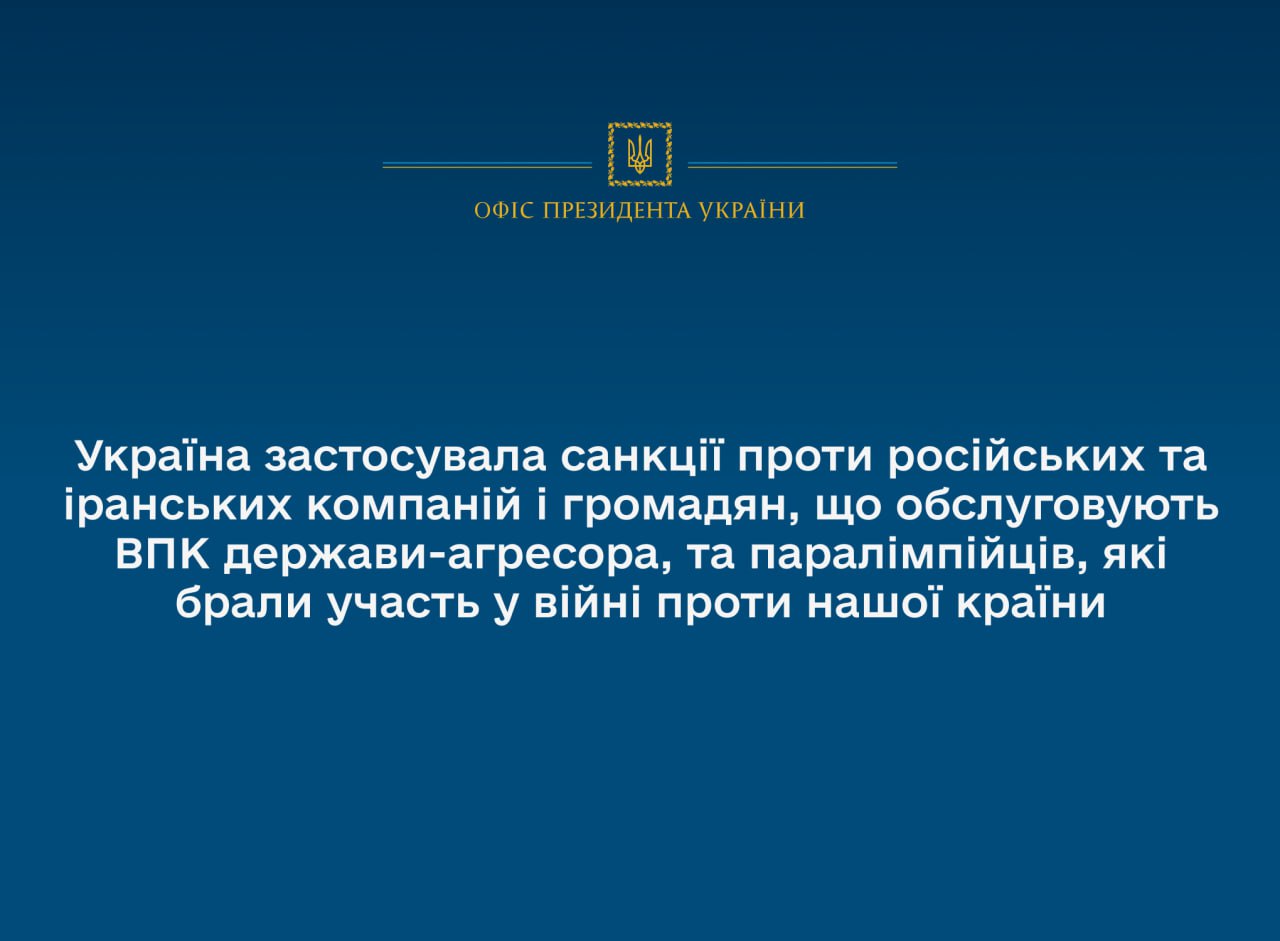 Президент України Володимир Зеленський підписав укази, якими ввів у дію рішення Ради національної безпеки і оборони України щодо застосування санкцій проти російських та іранських компаній і громадян, що обслуговують ВПК Росії, а також паралімпійців, які виправдовують агресію РФ та поширюють російську пропаганду.