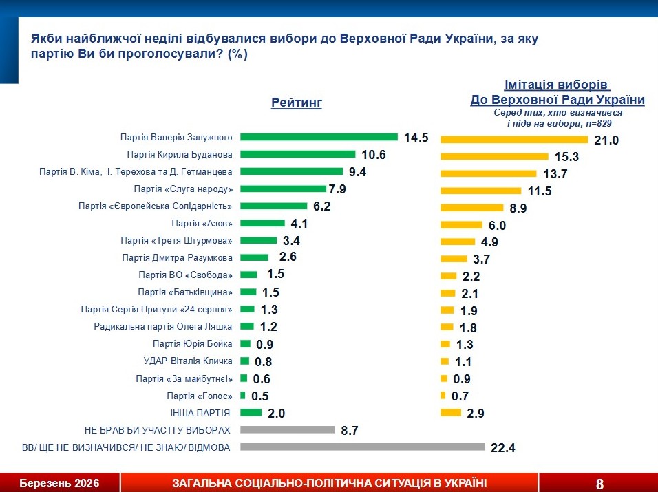 Висловилися українці і щодо партій, які б вони підтримали. 5-відсотковий бар’єр подолали б: «партія Валерія Залужного» – 14,5%, «партія К.Буданова» – 10,6%, «партія В.Кіма, І.Терехова та Д.Гетьманцева» – 9,4%, партія «Слуга народу» – 7,9%, партія «Європейська солідарність» – 6,2%/