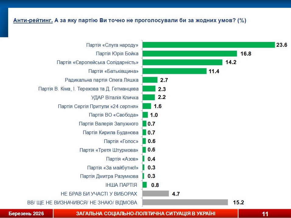 В період 12 – 18 березня 2026 року SOCIS провів дослідження щодо загальної соціально-політичної ситуації в країні, у межах якого телефоном було опитано 1204 респонденти за квотною стратифікованою вибіркою (статистична похибка вибірки (довірчий інтервал): +/- 2,5%).