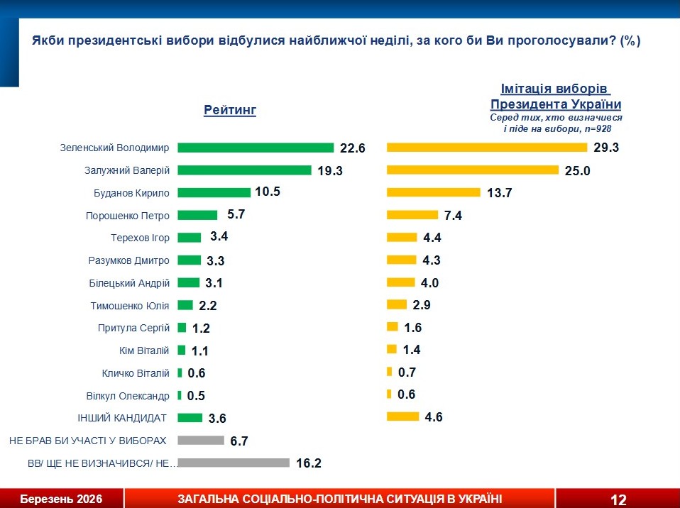 Щодо кандидатів на посаду президента України, обрати в один тур очільника держави не вдалося б, якби вибори проводилися найближчої неділі. Найвищі рейтинги серед українців мають такі діячі Володимир Зеленський – 22,6%, Валерій Залужний – 19,3%, Кирило Буданов – 10,5%, Петро Порошенко – 5,7%.
