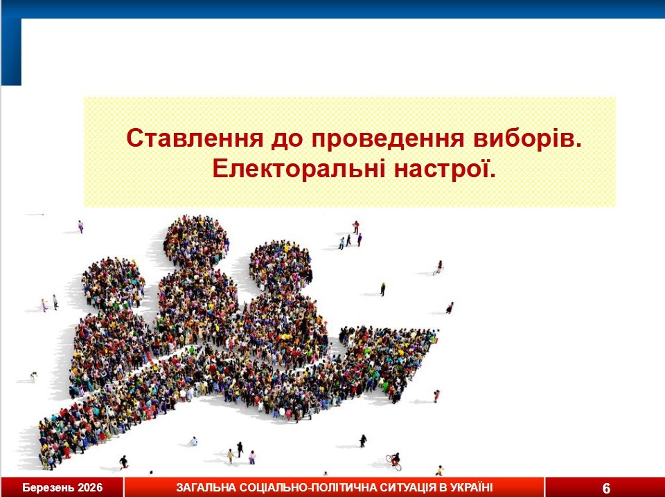 Якщо говорити про електоральні настрої та ставлення до виборів, більша частина опитаних не підтримує проведення виборів (52,5%). Але, якби найближчої неділі такі вибори відбувалися, то у них би взяли участь 76,9% опитаних.
