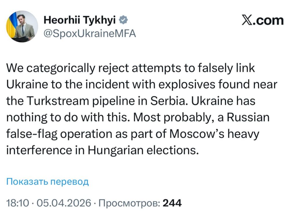 «Ми категорично відкидаємо спроби хибно пов’язати Україну з цим інцидентом. Україна не має до цього жодного відношення. Найімовірніше, це російська операція під чужим прапором як частина втручання Москви у вибори в Угорщині», — заявив Тихий.