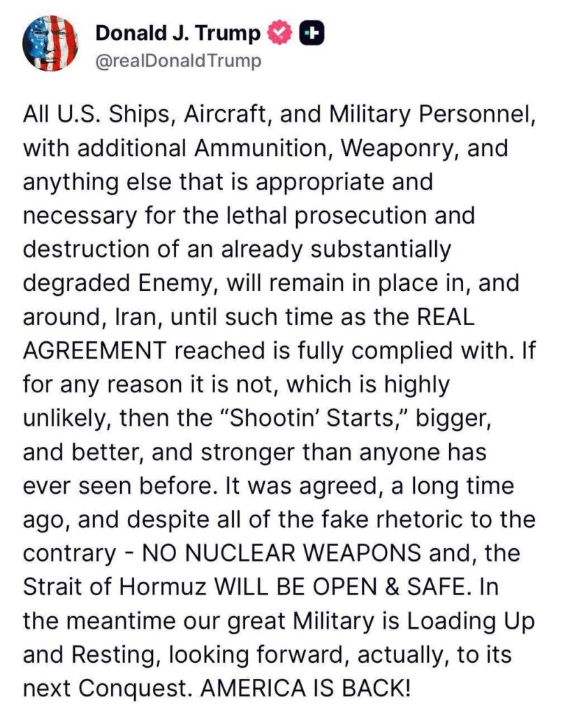 «Усі кораблі США, літаки та військовий персонал, із додатковими боєприпасами, озброєнням і всім іншим, що є доречним і необхідним для летального ведення бойових дій і знищення вже значно ослабленого ворога, залишатимуться на місці в Ірані та навколо нього, доки РЕАЛЬНА УГОДА, якої було досягнуто, не буде повністю виконана. Якщо з якоїсь причини цього не станеться, що вкрай малоймовірно, тоді “почнеться стрілянина” — більша, краща й потужніша, ніж будь-хто коли-небудь бачив раніше. Про це домовилися давно, і попри всю фальшиву риторику протилежного — ЖОДНОЇ ЯДЕРНОЇ ЗБРОЇ, а Ормузька протока БУДЕ ВІДКРИТОЮ І БЕЗПЕЧНОЮ. Тим часом наші великі Збройні сили поповнюють запаси та відпочивають, фактично з нетерпінням чекаючи свого наступного завоювання. АМЕРИКА ПОВЕРНУЛАСЯ!»