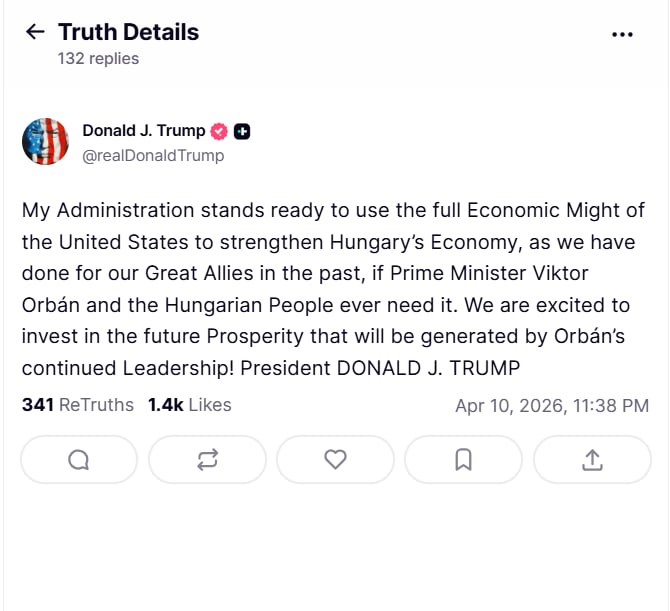 «Моя Адміністрація готова використати всю економічну міць Сполучених Штатів, щоб зміцнити економіку Угорщини, як ми вже робили це в минулому для наших великих союзників, якщо прем’єр-міністр Віктор Орбан і угорський народ коли-небудь цього потребуватимуть. Ми раді інвестувати в майбутнє процвітання, яке забезпечить подальше лідерство Орбана!».