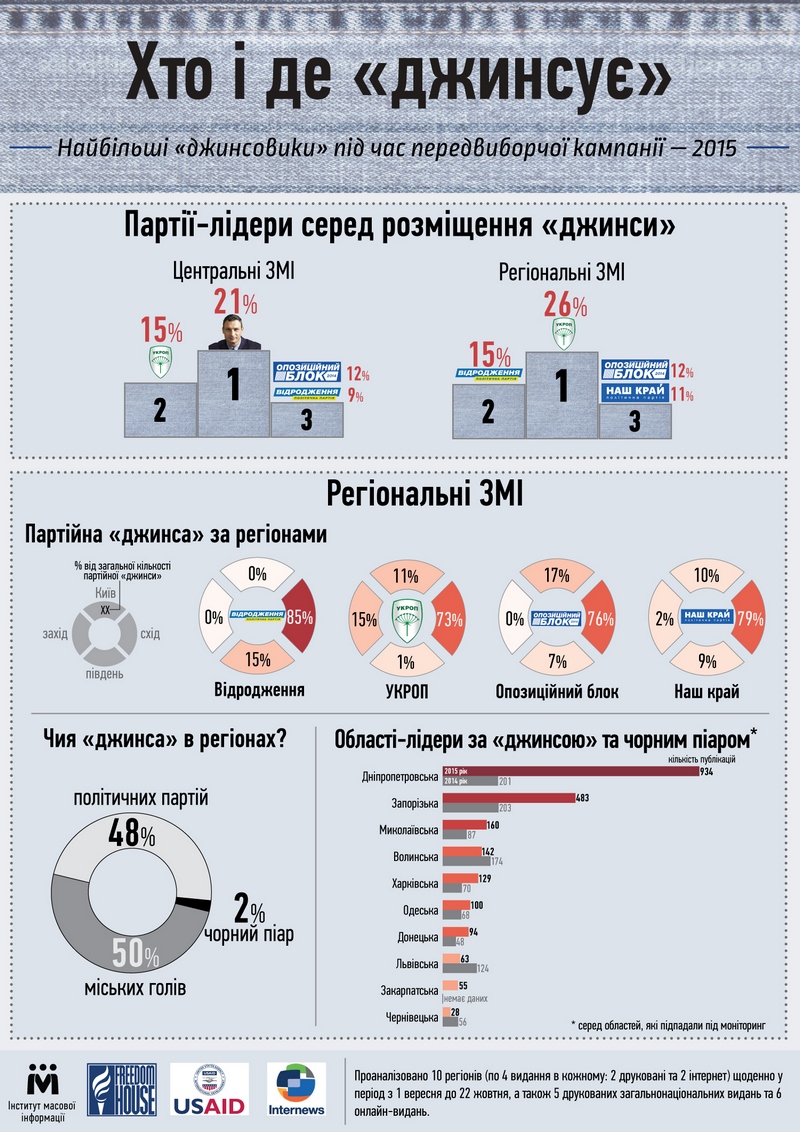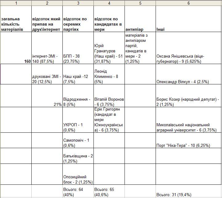 Следует отметить, что в Николаеве больше всего «джинсуют» в интернет-изданиях (87,5%), печатные же газеты в большинстве своем выпускают пиар-материалы кандидатов и партий, маркируя их в соответствии с законом пометками «политическая реклама» или «политическая агитация». Только 20 статей в газетах Николаева не были надлежаще промаркированы, а потому были зафиксированы как «джинса». В интернет-изданиях Николаева не было зафиксировано ни одного материала с пометкой «политическая реклама».