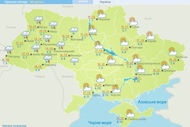 В ближайшие сутки, 30 апреля, в Украине синоптики прогнозируют осадки на западе страны, а также в Винницкой и Житомирской области возможны кратковременные дожди. Одновременно незначительно понизится температура воздуха, сообщила синоптик Наталья Диденко в своем Facebook, передает Корреспондент.