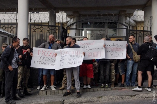 Около 20 человек стояли у входа с плакатами “Русские, водка закончилась. Уходите!”, “Оккупантам тут не рады” и прочее.