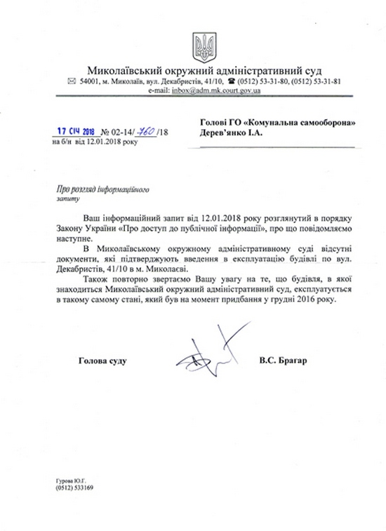 Игорь Деревянко обнародовал и официальный ответ из суда, в котором отмечается, что здание эксплуатируется в том состоянии, в котором было приобретено в декабре 2016 года.