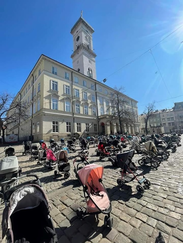 Во Львове провели акцию в память погибших в войне с Россией украинских детей. В центре города выставили 109 пустых детских колясок. Фото опубликовал в Facebook мэр Львова Андрей Садовой.