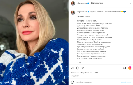 “Кто-то достает ее, чудом уцелевшую, из шкафа в разрушенном доме. А кто-то потерял вместе с домом. Кто-то ищет ее в другой стране, куда выгнала война. Кто-то наденет ее в родном городе, где наконец-то нет обстрелов. Кто-то – в оккупации, рискуя жизнью. А кто-то сделает это вообще впервые, потому что впервые почувствовал такую потребность. Этот день украинцы отмечают многие годы, но война наполнила его новым щемящим содержанием. Возможно, впервые мы так остро ощущаем смысл известного изречения о “вышитом коде нации”. Впервые это стало столь личным и острым. Впервые это о наших страшных потерях и об обязательной победе над врагом и горем. С Днем вышиванки, друзья!“