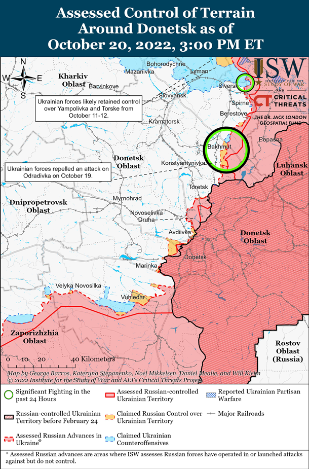 Зазначається, що 20 жовтня РИА Новости опублікувало карту, яка показує контроль України над більшою частиною Бахмута, незважаючи на неодноразові заяви численних російських джерел, що російські сили діють у самому місті.