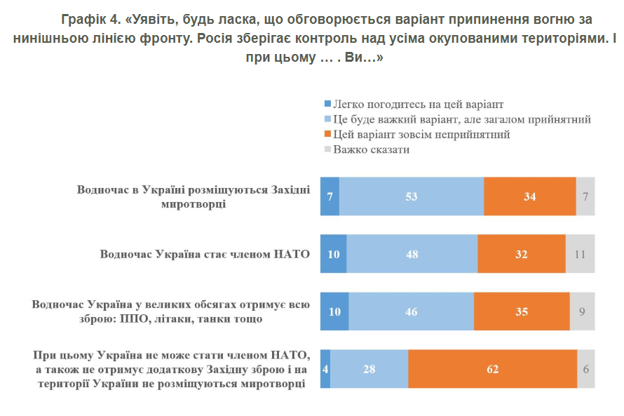 Якщо ж Україна отримає принаймні певні гарантії безпеки, то більше половини українців (хоча і неохоче) підтримають припинення вогню. При цьому різниця між різними варіантами гарантій (з точки зору підтримки від української громадськості) – доволі незначна.