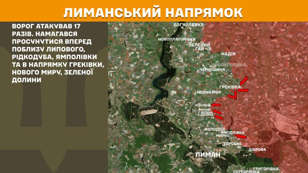 На Лиманському напрямку ворог атакував 17 разів. Намагався просунутися вперед поблизу Липового, Рідкодуба, Ямполівки та в напрямку Греківки, Нового Миру, Зеленої Долини.