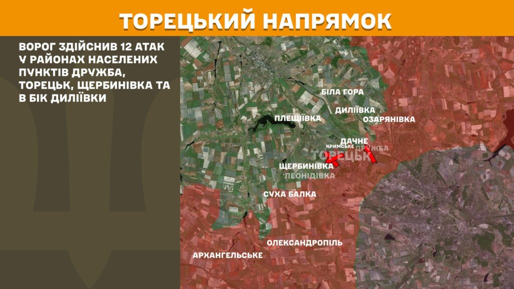 На Торецькому напрямку ворог здійснив 12 атак у районах населених пунктів Дружба, Торецьк, Щербинівка та в бік Диліївки.