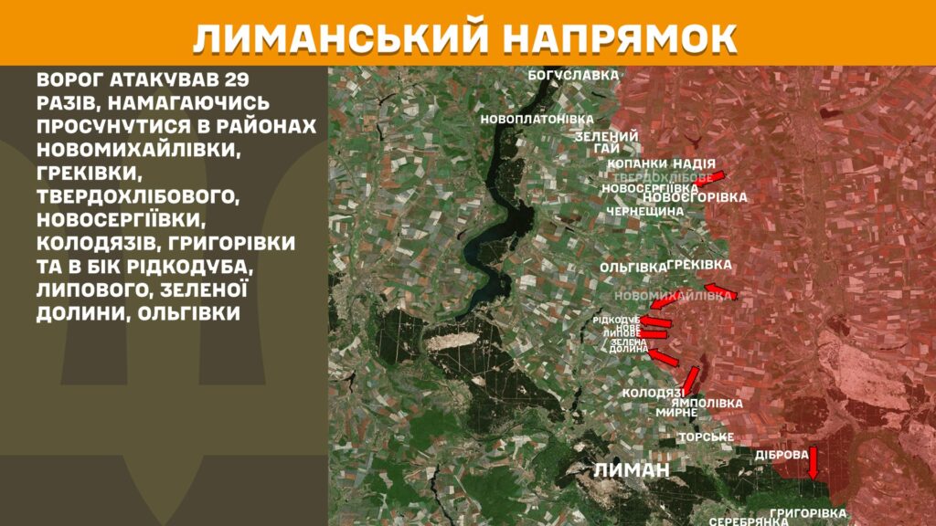На Лиманському напрямку ворог атакував 29 разів, намагаючись просунутися в районах Новомихайлівки, Греківки, Твердохлібового, Новосергіївки, Колодязів, Григорівки та в бік Рідкодуба, Липового, Зеленої Долини, Ольгівки.