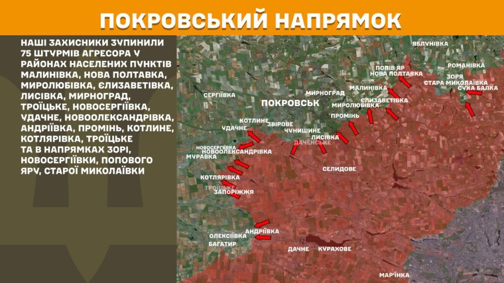 На Покровському напрямку наші захисники зупинили 75 штурмів агресора у районах населених пунктів Малинівка, Нова Полтавка, Миролюбівка, Єлизаветівка, Лисівка, Мирноград, Троїцьке, Новосергіївка, Удачне, Новоолександрівка, Андріївка, Промінь, Котлине, Котлярівка, Троїцьке та в напрямках Зорі, Новосергіївки, Попового Яру, Старої Миколаївки.