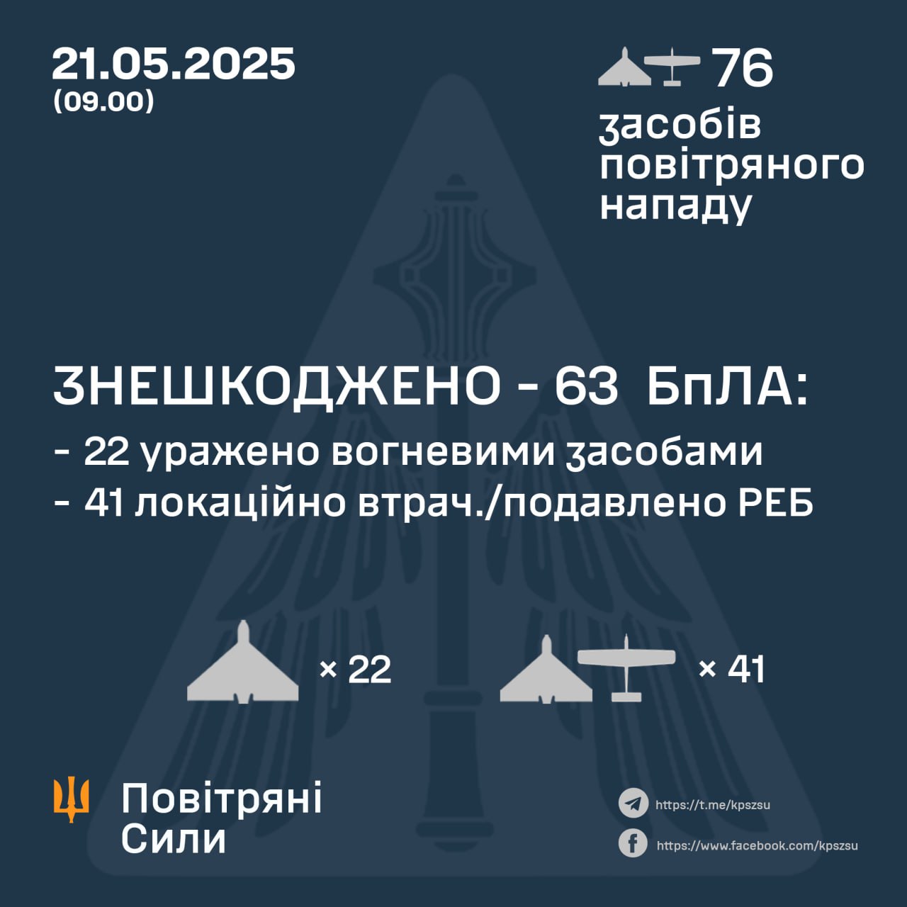 У ніч на 21 травня (із 00.30 21 травня) противник атакував 76-ма ударними БпЛА типу Shahed і безпілотниками-імітаторами різних типів із напрямків: Курськ, Орел, Брянськ – рф.