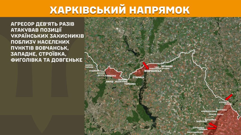 На Харківському напрямку агресор дев’ять разів атакував позиції українських захисників поблизу населених пунктів Вовчанськ, Западне, Строївка, Фиголівка та Довгеньке.