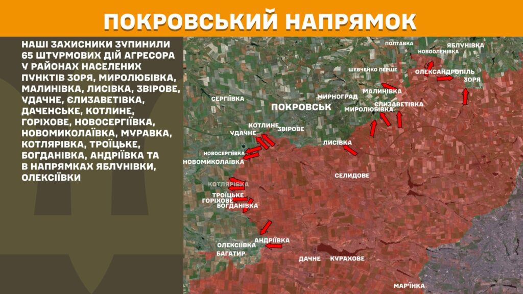 На Покровському напрямку наші захисники зупинили 65 штурмових дій агресора у районах населених пунктів Зоря, Миролюбівка, Малинівка, Лисівка, Звірове, Удачне, Єлизаветівка, Даченське, Котлине, Горіхове, Новосергіївка, Новомиколаївка, Муравка, Котлярівка, Троїцьке, Богданівка, Андріївка та в напрямках Яблунівки, Олексіївки.