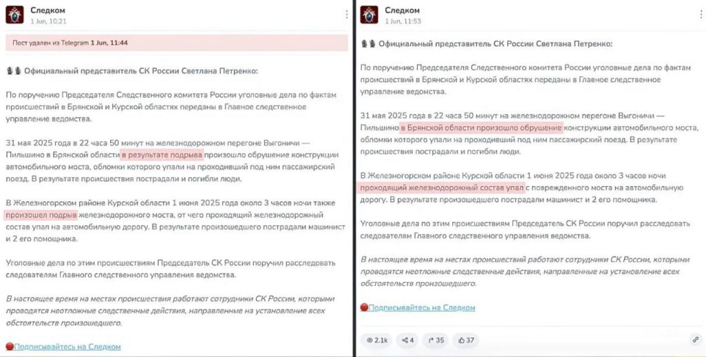 Як звернув увагу «Вот Так», коментар офіційного представника Слідчого комітету Росії Світлани Петренко було змінено: у новій публікації в телеграм-каналі відомства інцидент уже не називають підривом.
