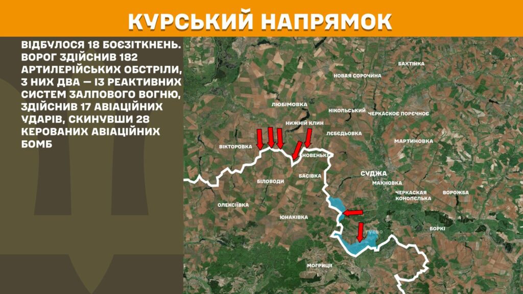 На Курському напрямку відбулося 18 боєзіткнень. Ворог здійснив 182 артилерійських обстріли, з них два — із реактивних систем залпового вогню, здійснив 17 авіаційних ударів, скинувши 28 керованих авіаційних бомб.