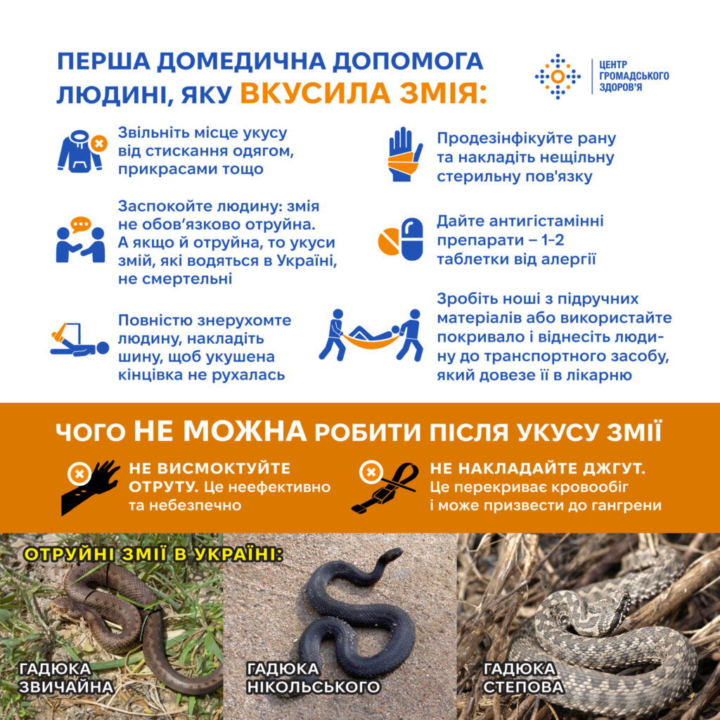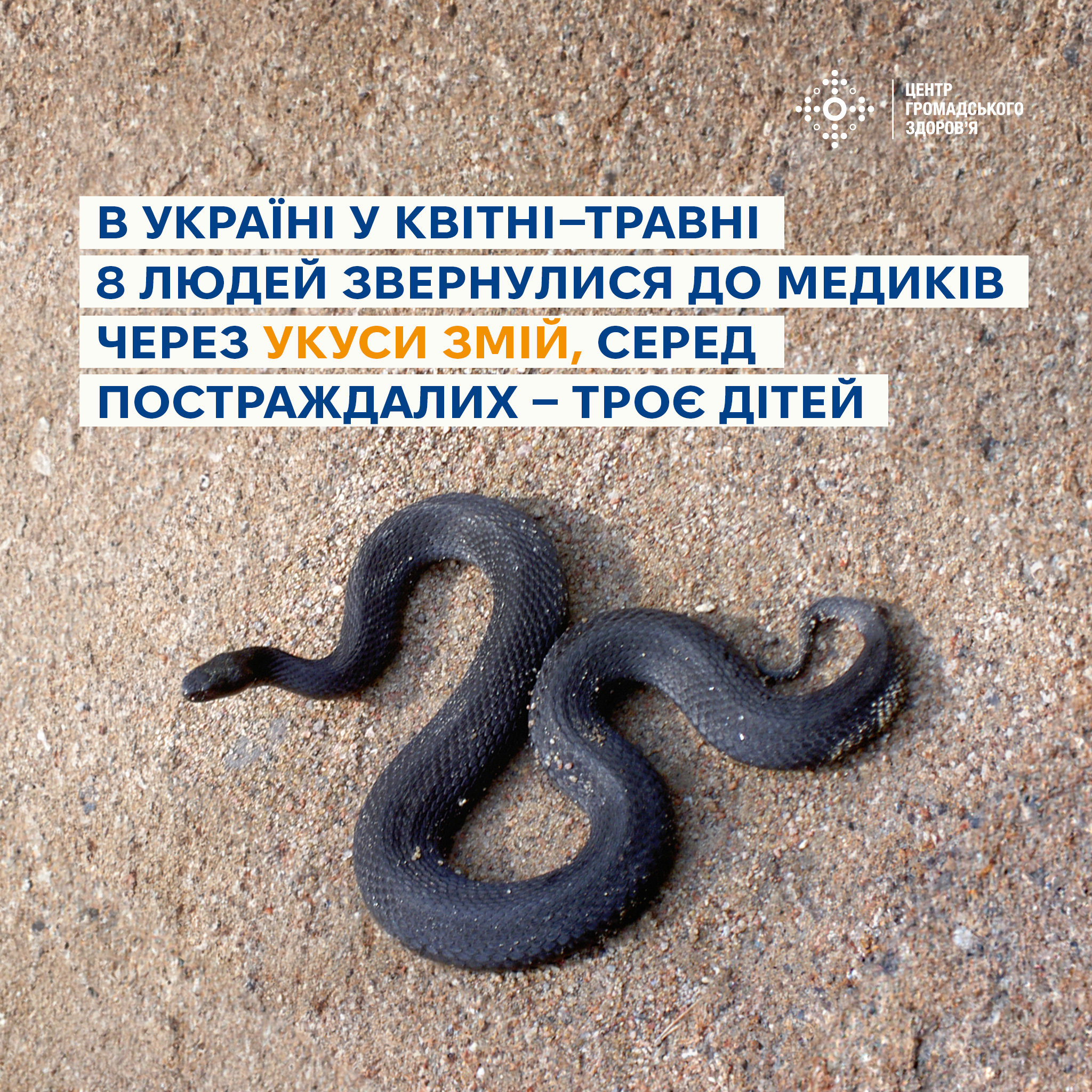 За квітень–травень 2025 року в Україні зареєстровано 8 звернень по медичну допомогу через укуси змій. Це на 23 випадки менше, ніж за аналогічний період торік. Серед постраждалих — троє дітей.