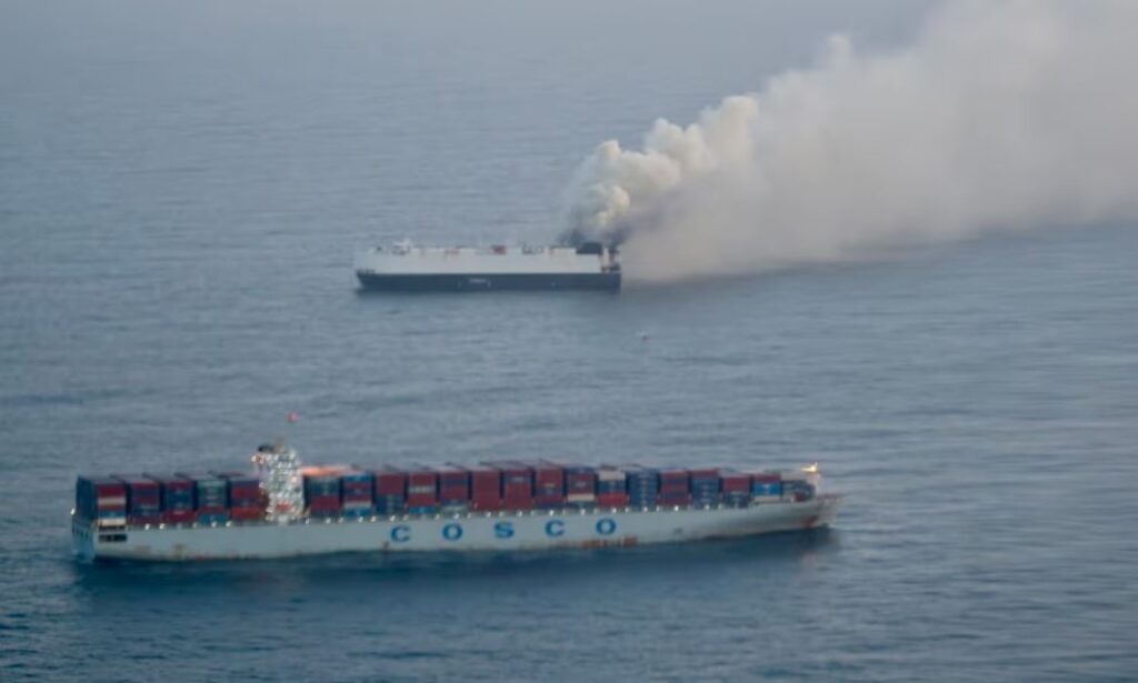Біля берегів Аляски спалахнуло вантажне судно, яке перевозило сотні електромобілів із Китаю до Мексики. Система пожежогасіння не змогла стримати вогонь, екіпаж покинув судно.