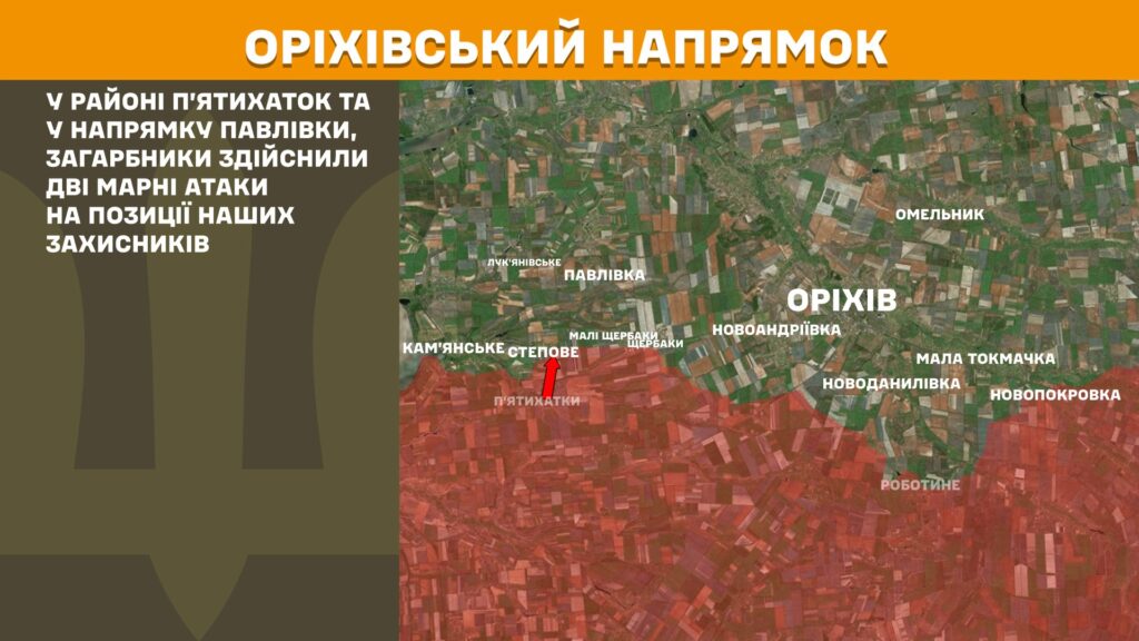 На Оріхівському напрямку, у районі П’ятихаток та у напрямку Павлівки, загарбники здійснили дві марні атаки на позиції наших захисників.