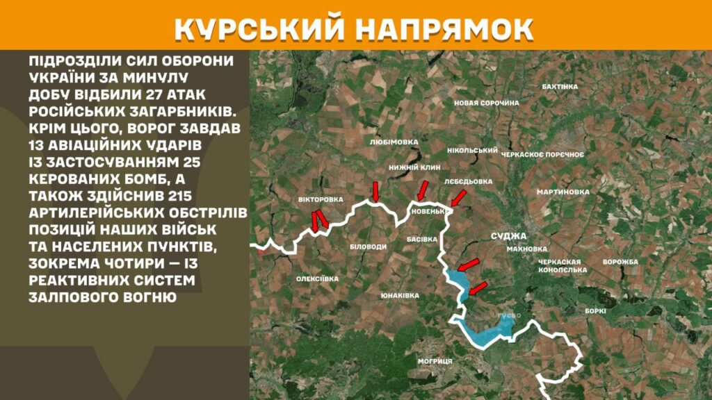 На Курському напрямку підрозділи Сил оборони України за минулу добу відбили 27 атак російських загарбників. Крім цього, ворог завдав 13 авіаційних ударів із застосуванням 25 керованих бомб, а також здійснив 215 артилерійських обстрілів позицій наших військ та населених пунктів, зокрема чотири — із реактивних систем залпового вогню.