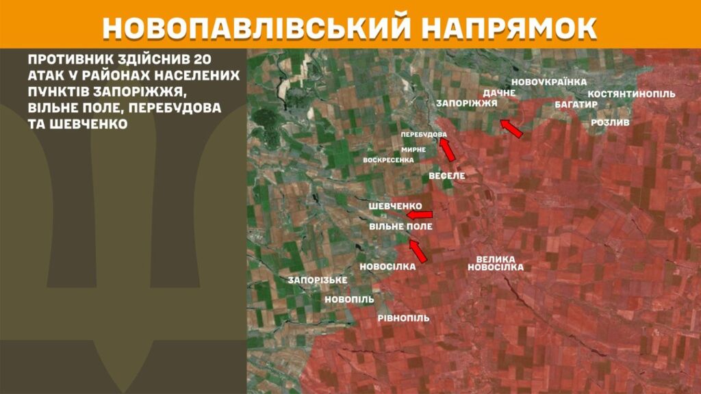 На Новопавлівському напрямку противник вчора здійснив 20 атак у районах населених пунктів Запоріжжя, Вільне Поле, Перебудова та Шевченко.
