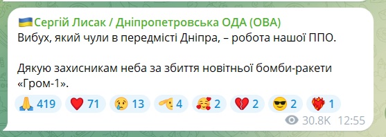 Начальник Дніпропетровської ОВА Сергій Лисак вже назвав тип збитої повітряної цілі – новітня бомба-ракета «Гром-1».