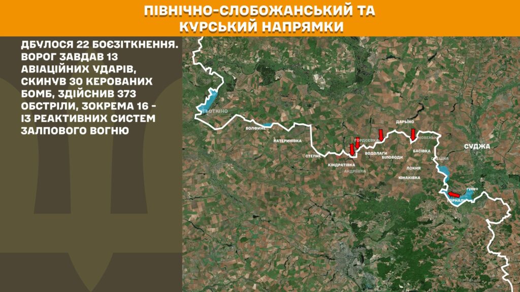 На Північно-Слобожанському і Курському напрямках минулої доби відбулося 22 боєзіткнення. Ворог завдав 13 авіаційних ударів, скинув 30 керованих бомб, здійснив 373 обстріли, зокрема 16 – із реактивних систем залпового вогню.