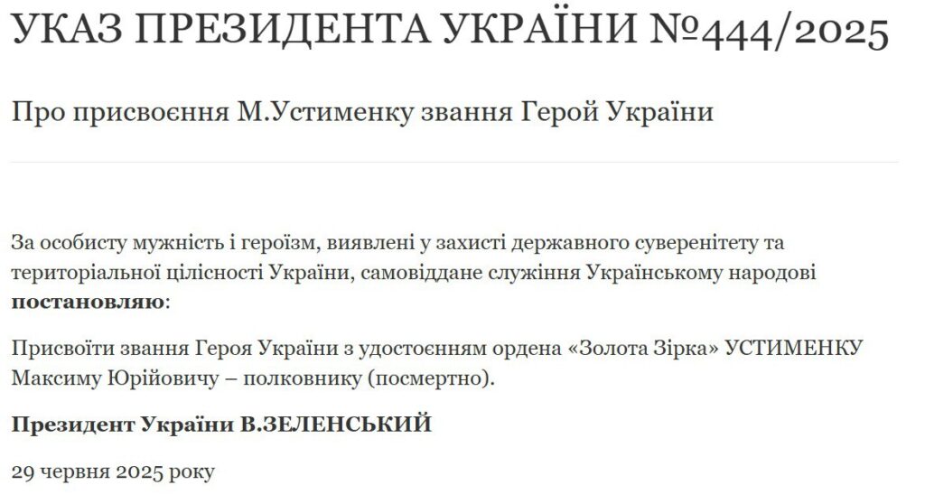 Зеленський присвоїв звання Героя України загиблому пілоту Максиму Устименку