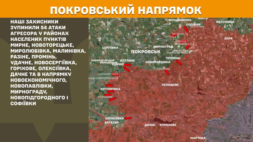 На Покровському напрямку наші захисники зупинили 54 атаки агресора у районах населених пунктів Мирне, Новоторецьке, Миролюбівка, Малинівка, Разіне, Промінь, Удачне, Новосергіївка, Горіхове, Олексіївка, Дачне та в напрямку Новоекономічного, Новопавлівки, Мирнограду, Новопідгородного і Софіївки.