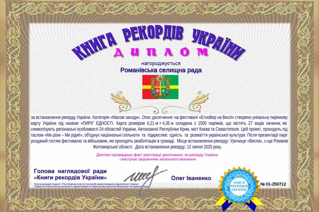 12 липня у селищі Романів на фестивалі “ЕтноВир на Виспі” представили пиріжкову карту України під назвою “Пиріг Єдності”. Її створили із 1500 пиріжків із 27-ма різними начинками. Витвір визнали унікальним і занесли до “Книги рекордів України”.