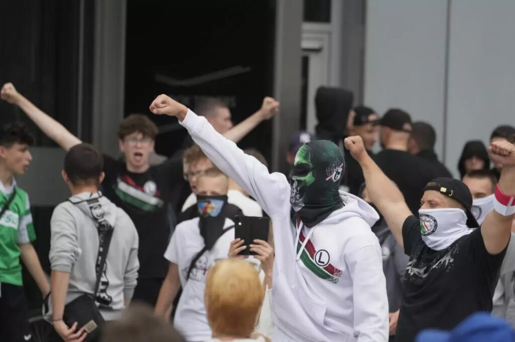 За пів години розпочалась інша акція, спрямована проти мігрантів. Серед учасників цієї ходи були, зокрема, група футбольних вболівальників варшавської «Легії». Вони вигукували антиурядові гасла, виражаючи своє незадоволення, та активно критикували політику прем’єр-міністра Дональда Туска та його міграційний курс.