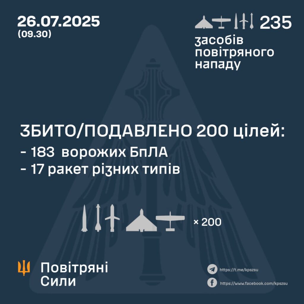 У ніч на 26 липня (із 20.00 25 липня) противник атакував 235-ма засобами повітряного нападу (208 БпЛА та 27 ракет різних типів):