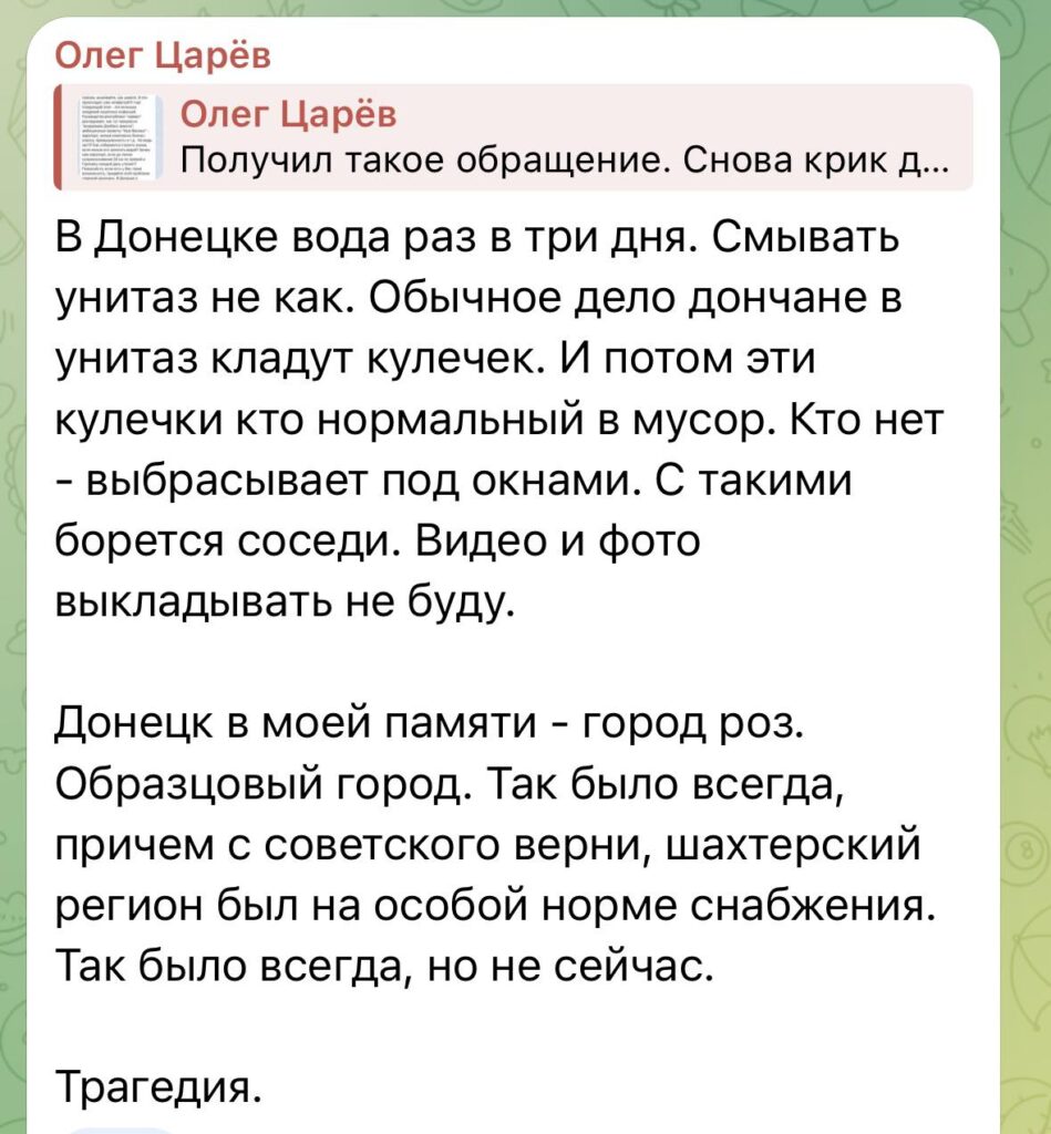 Про те, що в Донецьку вода тепер буде тричі на тиждень, стало відомо ще тиждень назад. Тоді на цю новину найяскравіше відреагував запроданець Царьов.