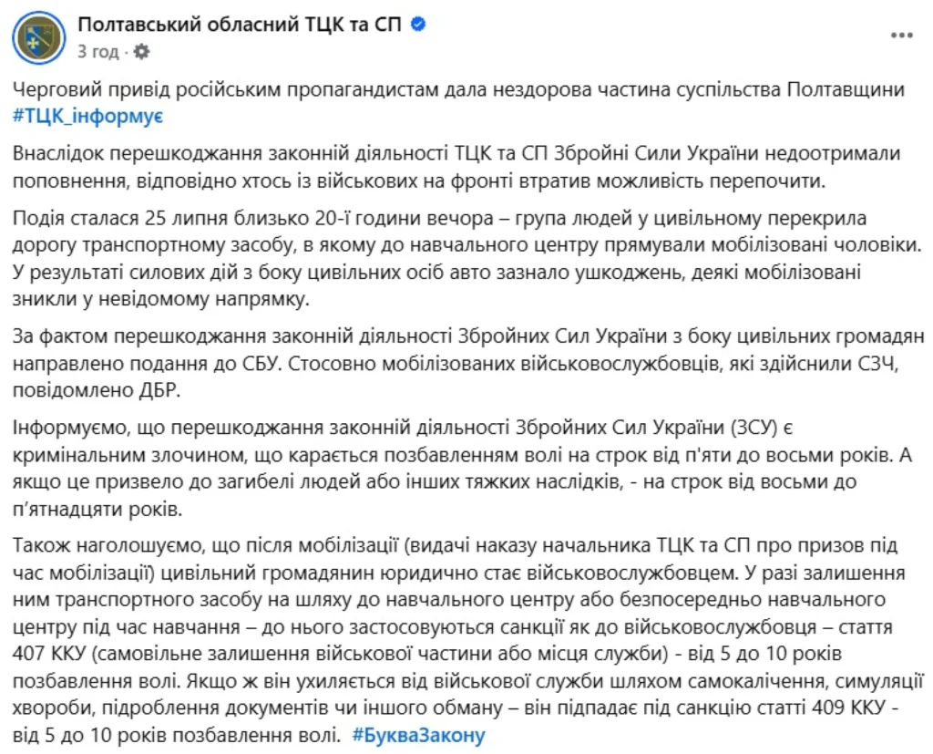У заяві військкомату вказано, що інцидент у ТЦК стався о 20 год 25 липня. Як з’ясувалось, група цивільних заблокувала мікроавтобус, який перевозив мобілізованих до навчального центру. Через силові дії нападників авто отримало пошкодження, а кілька військовослужбовців втекли. Полтавський обласний ТЦК нагадав, що через втечу цих громадян люди на фронті не зможуть перепочити від боїв.