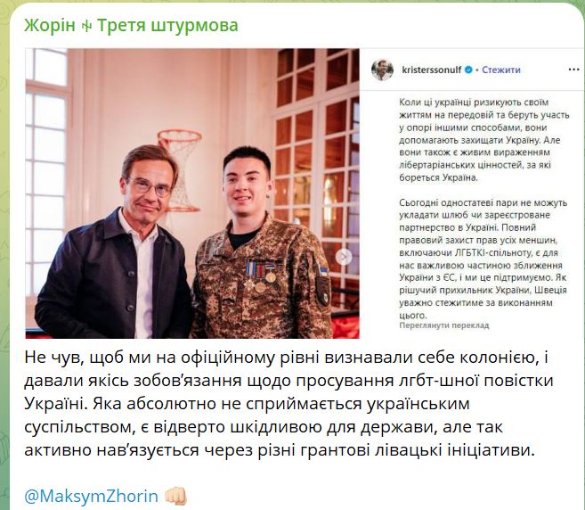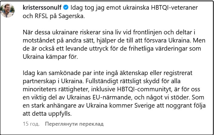 Сьогодні одностатеві пари не можуть укласти шлюб або зареєструвати партнерство в Україні. Повний правовий захист прав усіх меншин, включаючи ЛГБТК-спільноту, є для нас важливою частиною наближення України до ЄС, і ми це підтримуємо. Як сильний прихильник України, Швеція буде ретельно стежити за виконанням цього”, — написав Крістерссон в Instagram.