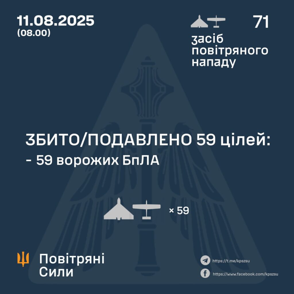У ніч на 11 серпня (із 20.30 10 серпня) противник атакував 71 ударним БпЛА типу Shahed і безпілотниками-імітаторами різних типів із напрямків Шаталово, Курськ, Міллерово, Приморсько-Ахтарськ – рф.