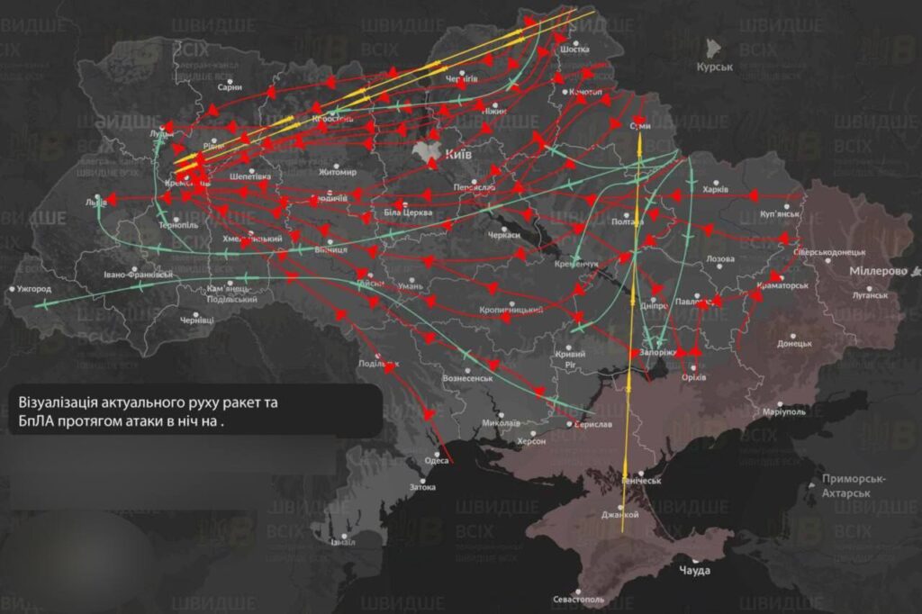 Як повідомляли моніторингові канали, рух дронів та ракет над Україною виглядав так.